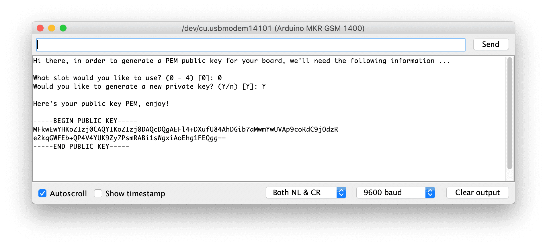 The private and public can be generated using an example sketch from the ArduinoECCX08 library. Open the sketch in the Arduino IDE using the File -> Examples -> ArduinoECCX08 -> Tools -> ECCX08JWSPublicKey. Click the "Upload" button to build and upload the sketch to your board, then open the Serial Monitor. Make sure the line ending configuration is set to "Both NL & CR."