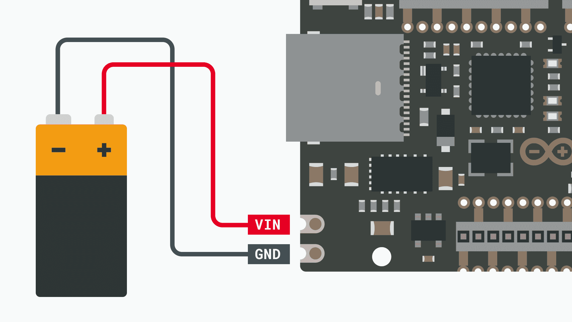 Unlike the classic UNO, the UNO Mini LE does not have a barrel jack plug. Although there are two pins dedicated for external power sources, such as batteries. Look for the VIN and GND pins at the corner of the board, and connect your power source (+ to VIN, - to GND).